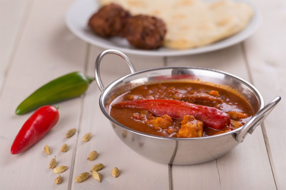 Vindaloo est un curry indien très populaire et est souvent l’un des aliments indiens les plus chauds du menu dans les restaurants indiens. Le terme vindaloo fait référence à «viande marinée dans le vin et l’ail» et contient du piment, parfois du lait de coco et une variété d’épices.