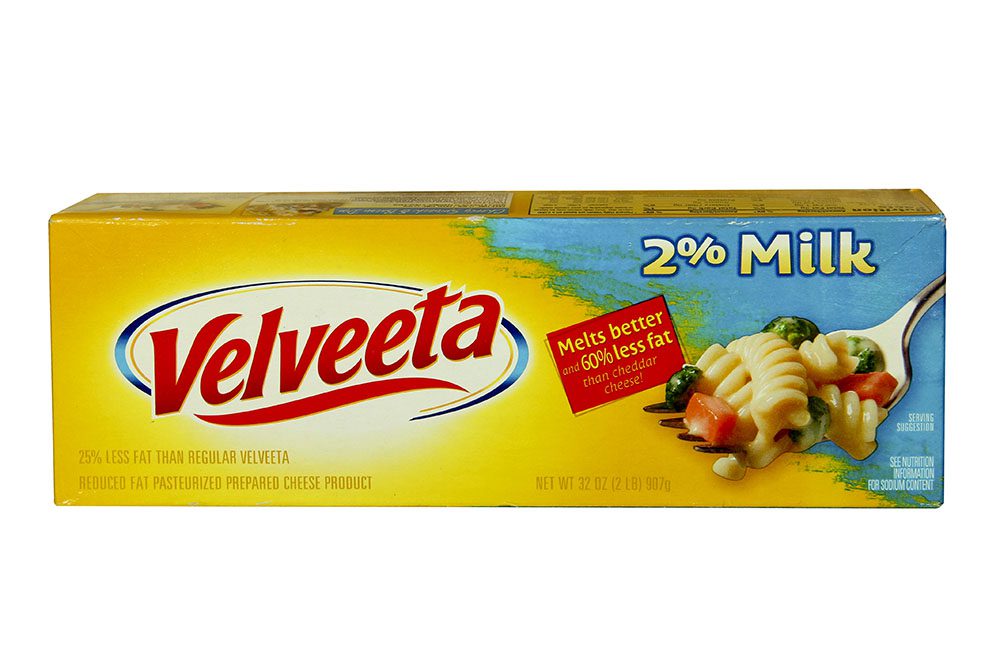 Velveeta était à l’origine fabriqué à partir de vrai fromage. Maintenant, il est principalement fabriqué à partir de concentré de protéines sériques, de concentré de protéines de lait, de lait, de matières grasses et de conservateurs.